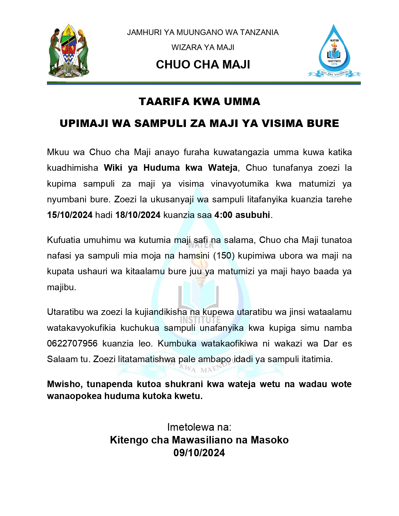 Tangazo la kupimiwa ubora wa maji ya visima bure